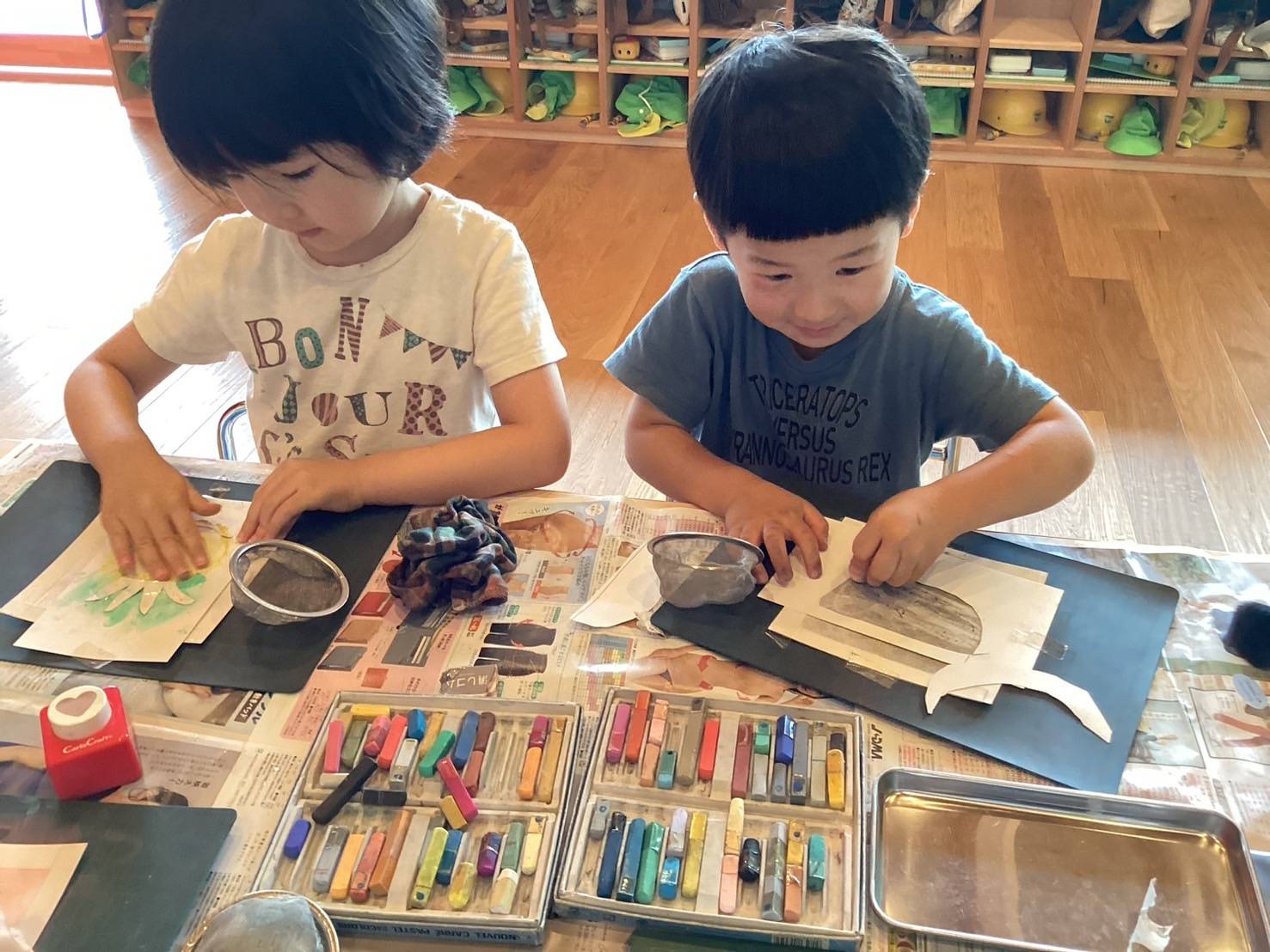暑い夏の時期、涼しい時間帯、テラスでの活動により夏の匂いを嗅ぎ、風を感じ、音を聴き、風景を観て、育てた野菜や果物を食べて五感が育ちながら、くつろぎスペースや子どもの遊び場、自然物での制作場として活用しております。